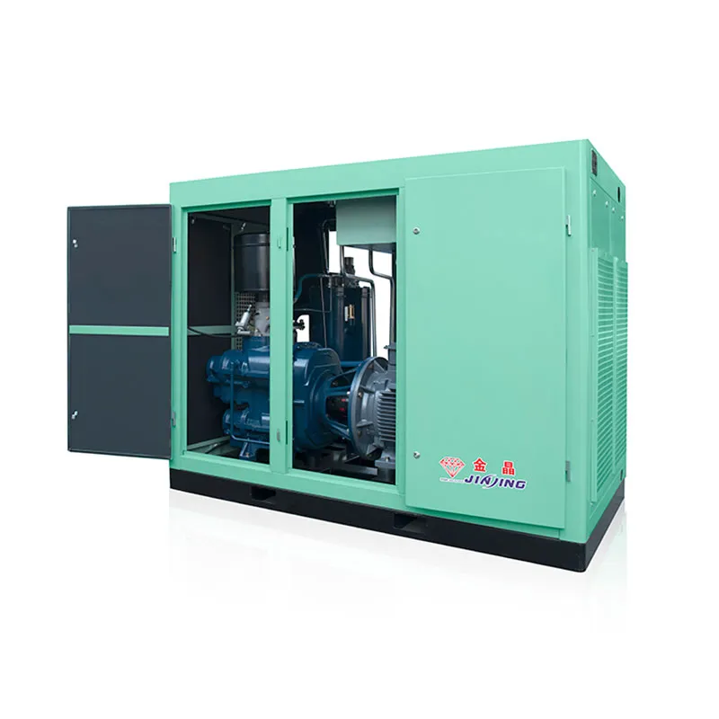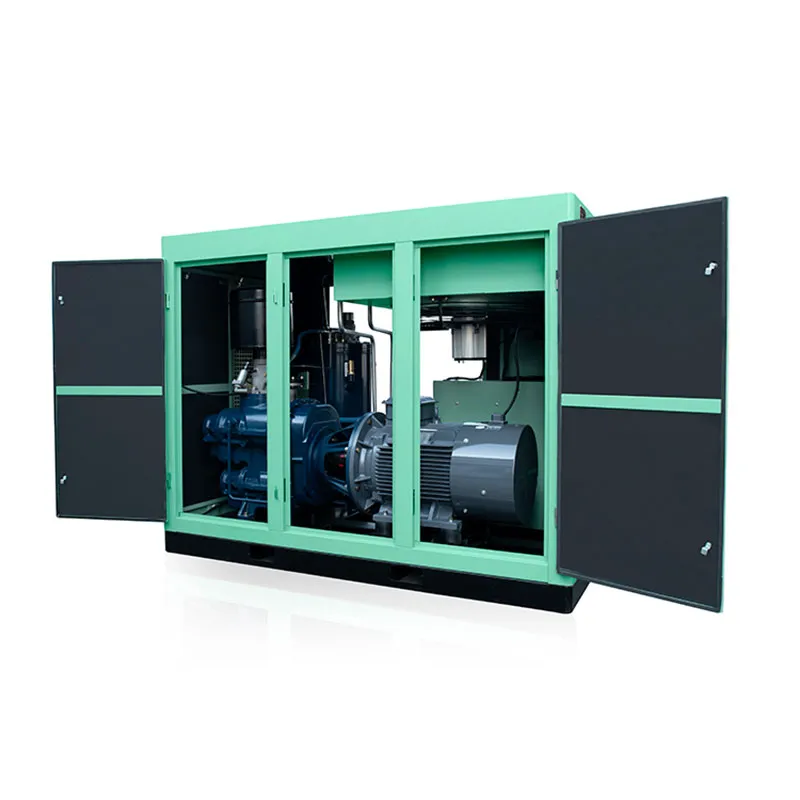 По сути, двухступенчатое сжатие заключается в объединении ротора первой ступени сжатия и ротора второй ступени сжатия в корпусе и непосредственном их приводе через косозубые шестерни. Природный воздух поступает на первую ступень сжатия через воздушный фильтр, где он смешивается с небольшим количеством смазочного масла в камере сжатия, и в то же время смешанный газ сжимается до межступенчатого давления.